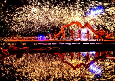 10月5日,在四川省成都市双流区黄龙溪古镇,民间艺人表演非遗“火龙灯舞”。新华社发